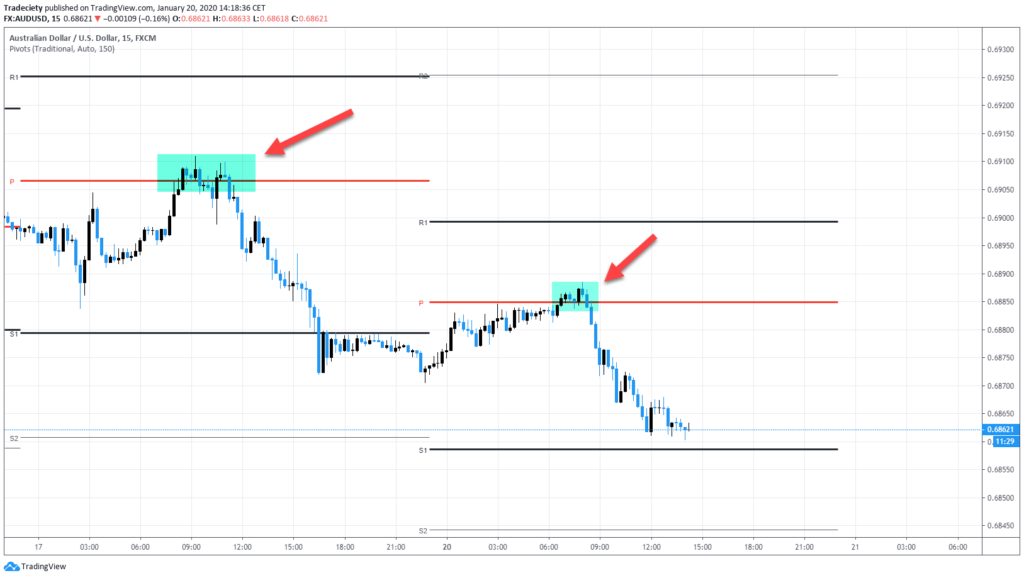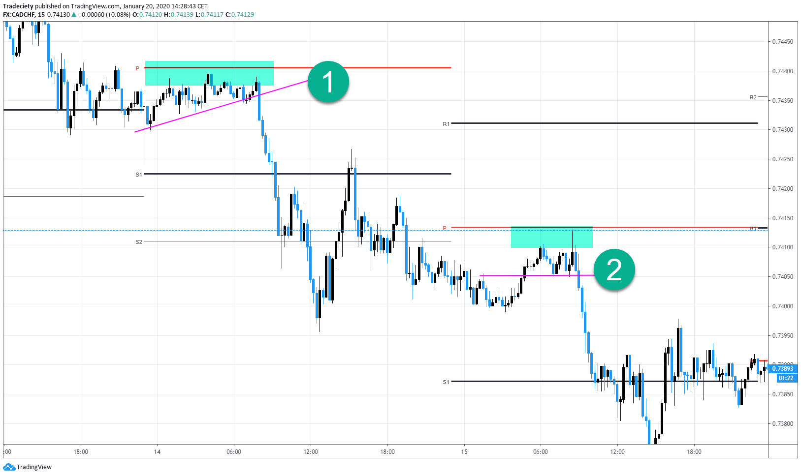 In the screenshot below, you see two such examples. The price tried, on two consecutive days, to break the central Pivot Point from below but failed each time. The price wasn’t able to stay above the central Pivot Point. Especially during long-lasting trending phases, trend-following entries could be times using the failed breakout approach.