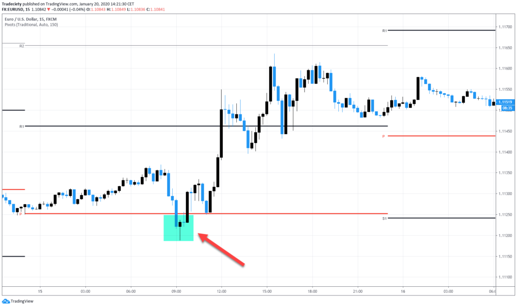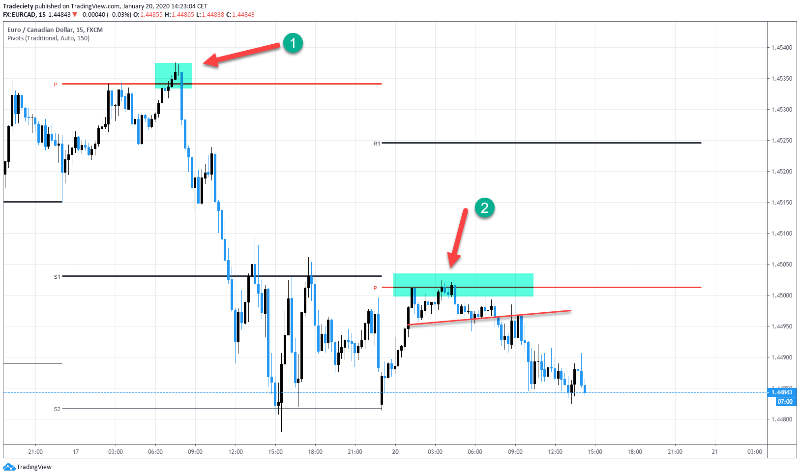 On the left, you see how the central Pivot Point acted as support multiple times at point (1) and (2). At point (3), the central Pivot Point acted as a resistance. Especially the central Pivot Point works well because a lot of traders use it. In the later part of this article, we will take a look at trading strategies that are based on the central Pivot Point.