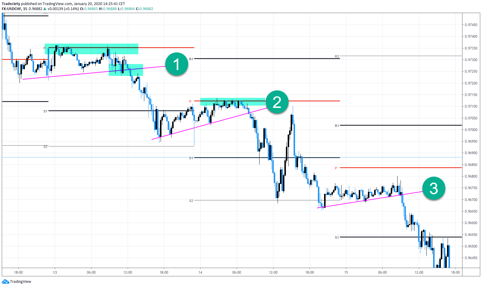 In the screenshot below, the price hovered below the central Pivot Point at points (1) and (2) for a long time. Simultaneously, a trendline was established during that time below the central Pivot Point. Then, a trader would only need to wait for the price to break the trendline to start looking for trading opportunities.
