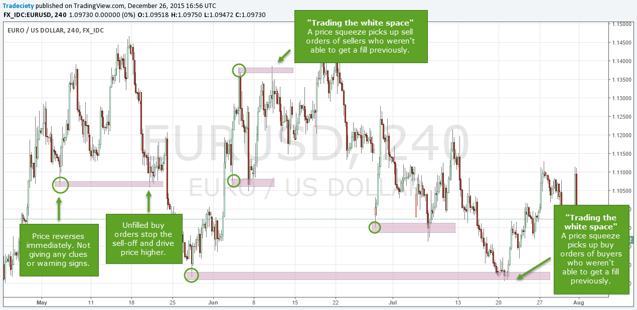 “Trading the white space” means that price picks up unfilled orders and squeezes traders on the wrong side of a market.