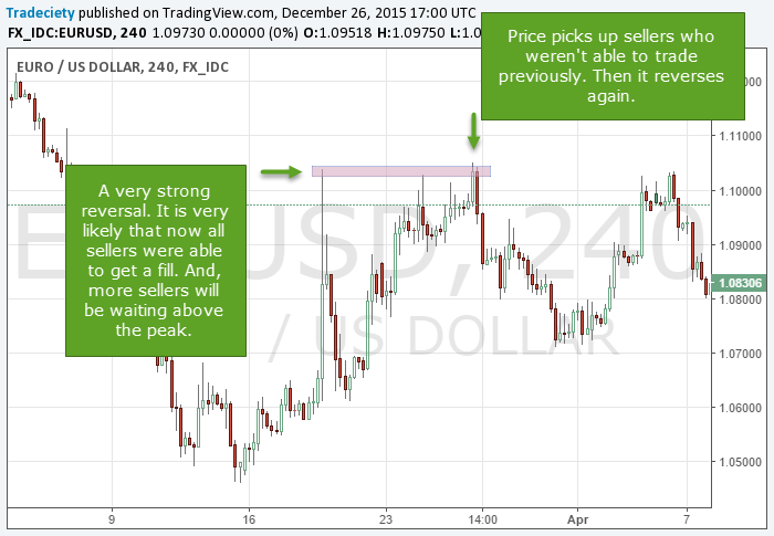 Think about it from a neutral perspective: What does it tell you about price when you see a rally and then all of a sudden price reverses in one candle and starts a strong sell-off? Exactly. The number of sellers who have entered the market at that price outnumbered buyers that price wasn’t able to withstand it and immediately tumbled. It takes a lot of sell orders to stop a trend and even reverse it.