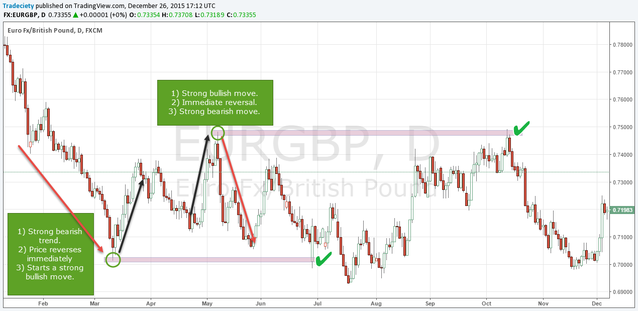 Just pull up any price chart and try to find those areas when the trend immediately reversed. The stronger the rejection of the level and the stronger the trending moves before and after the reversal, the higher the likelihood that you will see a new reaction the next time price comes back.