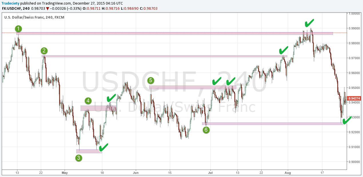 The chart below shows 6 price points that qualify as high probability price areas. All of those 6 areas show great imbalances between buyers and sellers and a sudden shift in direction. The turning points marked with numbers are initial price imbalances between buyers and sellers. The trading opportunities exist when price moves back into those areas – the areas marked with green checkmarks.
