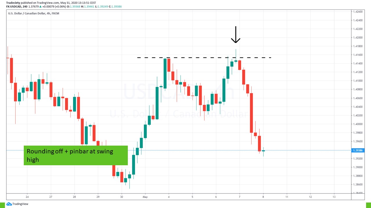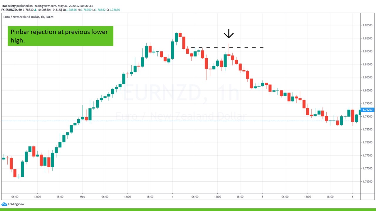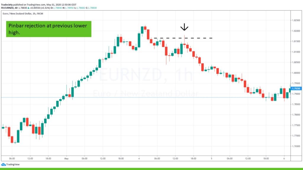 Prior to the pinbar, the uptrend has already turned. Whereas previously, the price made higher highs and higher lows, the pinbar marks the second lower high. Such a shift in trend sentiment is already a strong bearish signal. But when the lower high occurs with a pinbar rejection, the bearish signals is reinforced.
