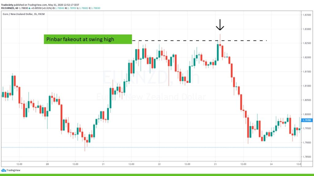 The fakeout happened as a pinbar. Furthermore, the concept of deceleration and acceleration can also be observed around the pinbar and show the gradual change from bullish to bearish market.