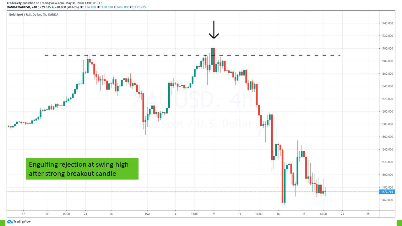 In the scenario below, the price tried to break above the previous highs but was rejected immediately within the next candle. The rejection candle is so large that it completely engulfed the bullish breakout candle.