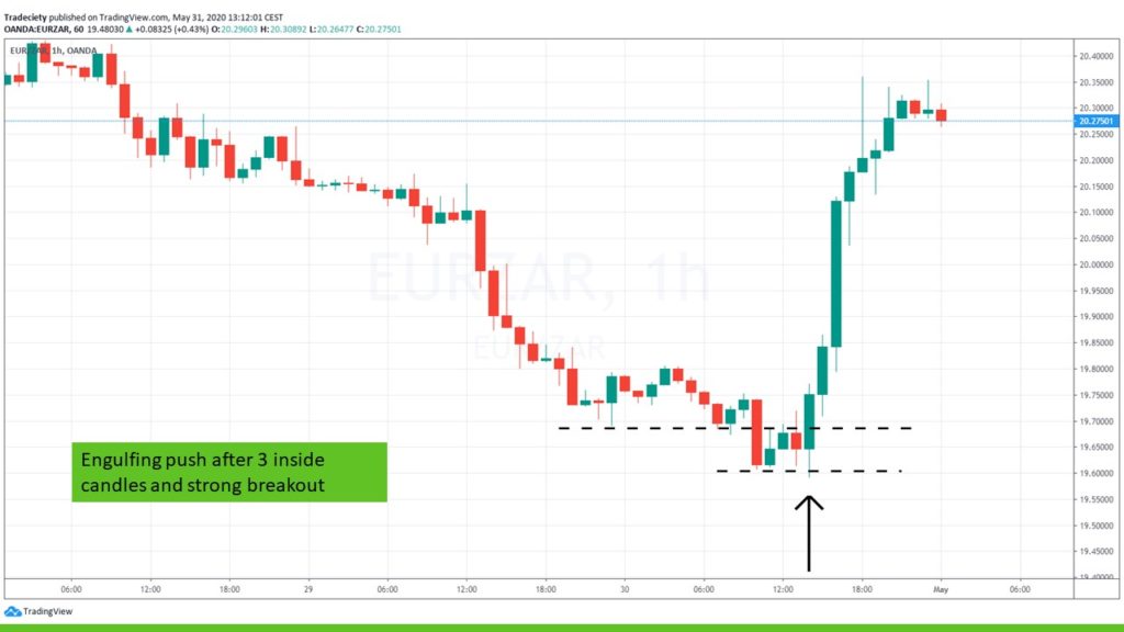 In the scenario below, the price already started a new bearish trend. The engulfing candle breakout marked the end of the first consolidation and led to a trend continuation.