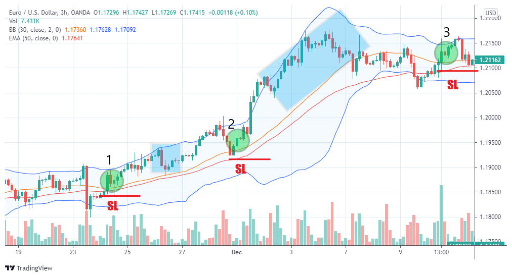 As for the take profit, you could exit the market right after the first pullback from the upper band, but you can wait until the price clearly corrects and gets closer to the mid-band (blue area).