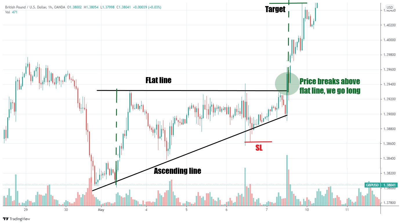This strategy is simple to implement if you can accurately spot ascending and descending triangles, which is not a big deal. Make sure that the resistance level isn’t cutting through any candlestick bodies – however, cutting through the wicks may be ok.