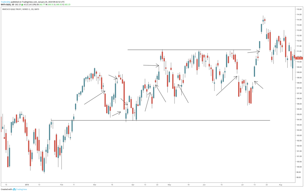 Common gaps often occur when price is ranging. These types of gaps are not big in size and get filled relatively quickly. The screenshot below shows the price chart for QQQ. Price is ranging and common gaps occur frequently within the range without any signaling effect.