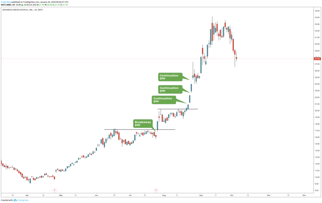 Continuation gaps occur in the middle of trends. In an uptrend, a gap upwards signals a continuation and it shows that additional buyers entered the market to push price higher.