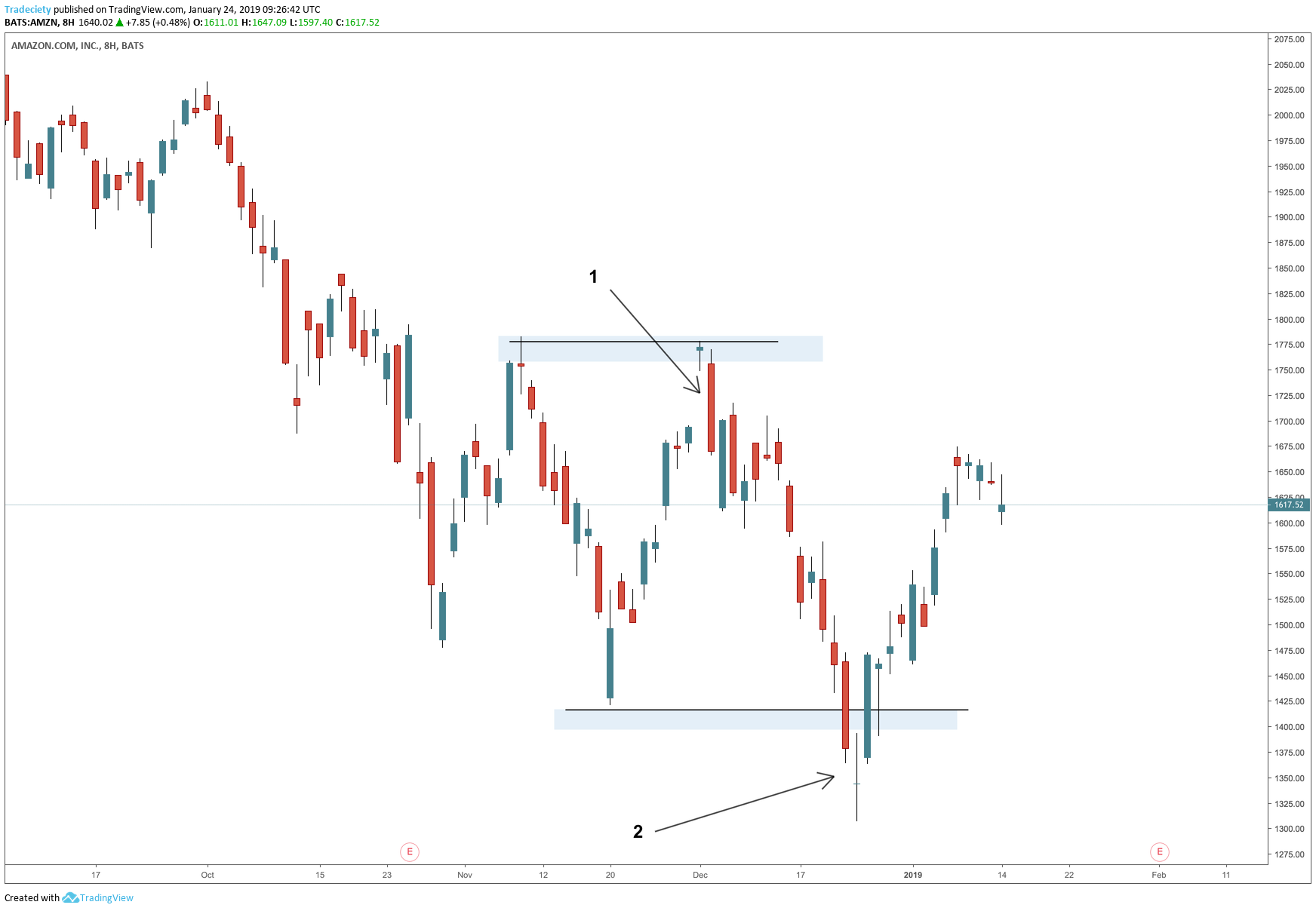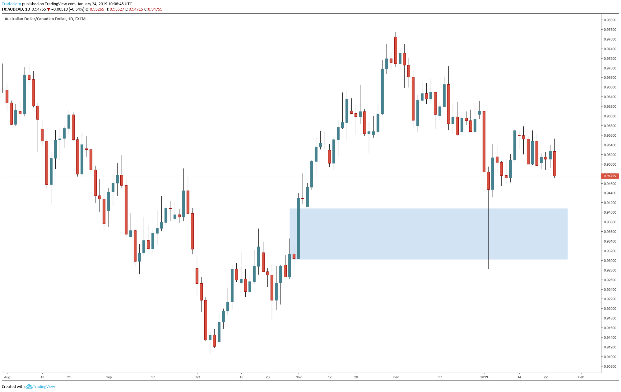In Forex, gaps happen less frequently, but there is a similar mechanism we can observe. Extremely long candles often tend to get “filled” again. The price usually has an easy time reaching the origin of such long candlesticks. Below you see how the long candle on the AUDCAD got filled with another strong rejection. The price does not face any support/resistance on the way down through such a candlestick.