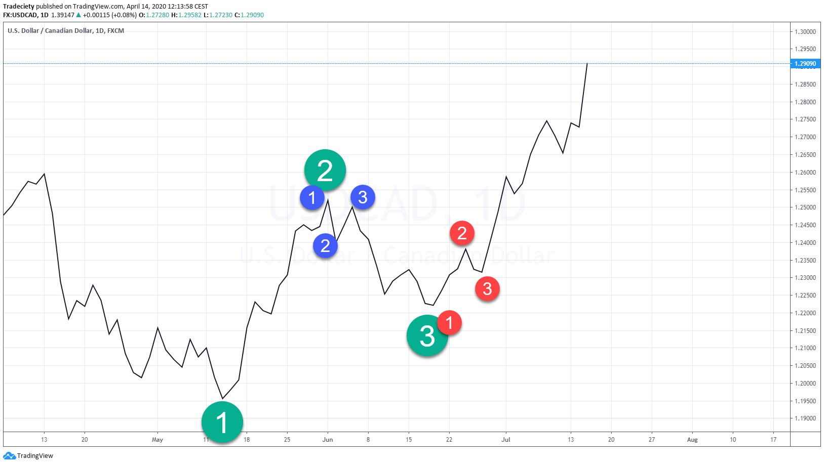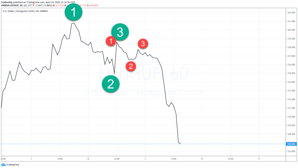 So even within the bigger picture you will often be able to find the one two three pattern. And you could either wait for the point 3 to form, you could wait for the point 2 to break into new high. That is then up to the trader how he likes to structure those traits and when we look at the other seven trading strategies, you will be able to combine those as well. So maybe you use the one two, three as your core foundation and then you, you lay over the trend line break or the deceleration and acceleration, maybe a spring formation. All of those will be discussed in a bit. So here you can see we have a downtrend and at the origin of the downtrend we have one, two and three but obviously we need to wait for the three to form. And if you don’t want to get in too late, and by late means that usually people wait for point 2 to break,