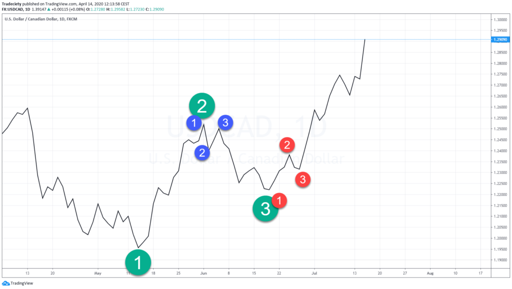 So at a new uptrend starts at the bottom, then it has its first up trending leg comes to the end at point 2 and then the first retracement stops at point 3 and this is often where traders look for pull back opportunities because now it is obvious that the market has made a higher low and that the trend is really rolling over to a new uptrend. And then a trader look for pullback entries around a point 3 and when we break down waves and when we break down price to an even smaller level, we will be able to find one two three patterns across the board. So within this one to two move, we can look at the smaller price action here and you can also see a one, two and three moves. So the trader looking at granular price movements may be able to trade a disk downward leg to point 2 to three.