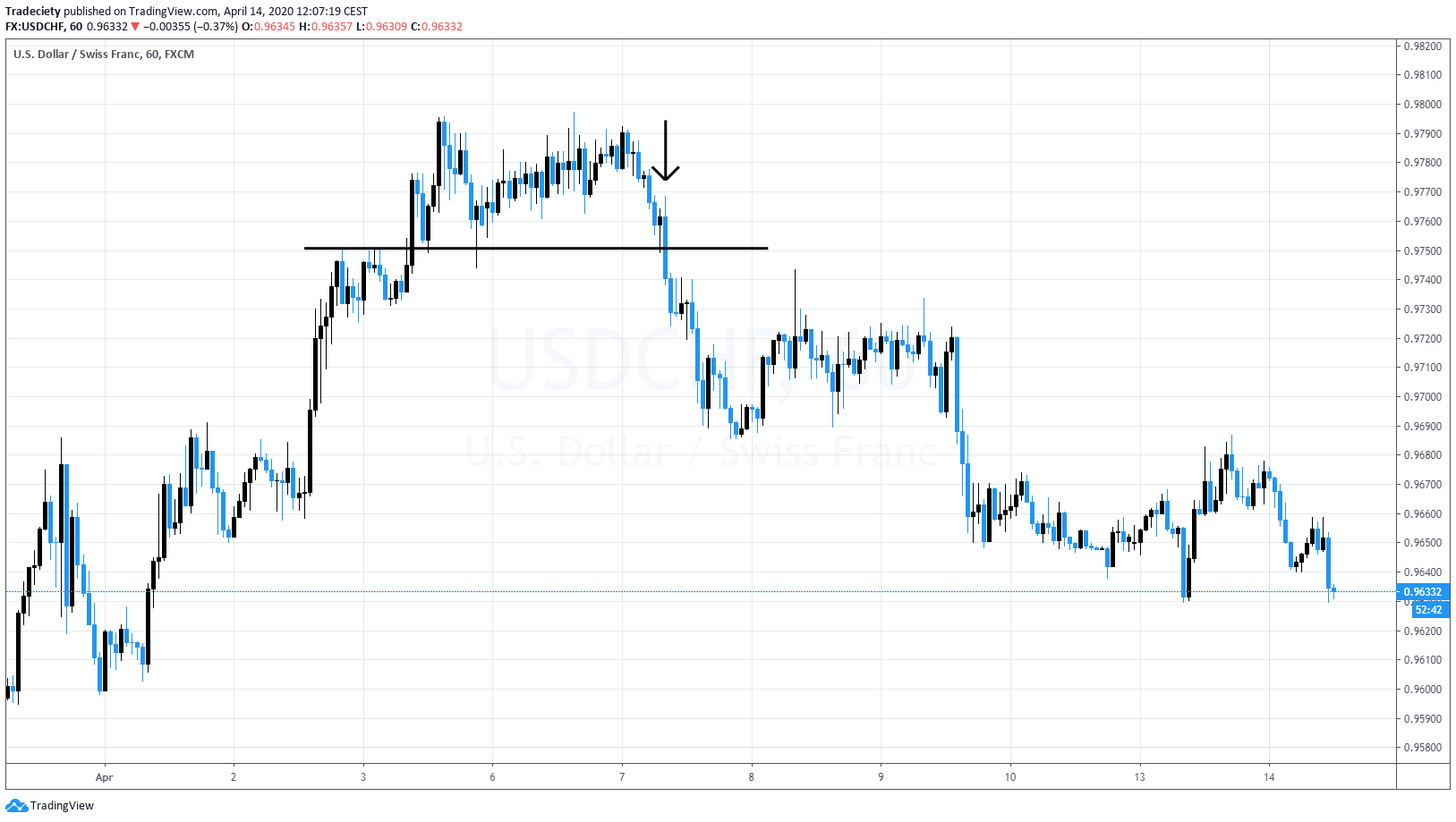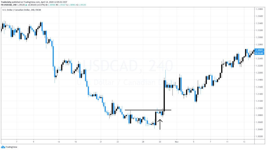 I’ve talked about this a few times and what it means is that you look for an established downtrend or an uptrend. In this example, we have a downtrend. You wait for the pattern and for the price action to slow down. Here in the bottom when you put an RSI for example or a Meg D, you will see that we have a divergence here and then you have this double top here but at the low of the pattern so we have one swing point high. We have another swing point here and before the market takes off, this is the buildup. The market is really sticking to the level. It’s not able to break higher but more importantly it’s not able to push lower so it’s not coming close to the previous low at all which already indicates more building bullish pressure and then you could go to a lower timeframe and wait for the breakout to happen here to time your entry. Here we have a bearish scenario.