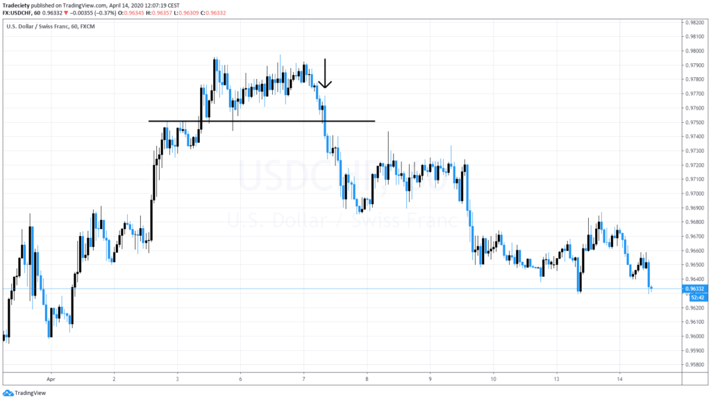 Here another example, the market is coming from an uptrend. Then from this area to this area the price just barely was able to make a higher high, which is already here, a very weak signal and you can see after we have established a top, you can see we make lower high and lower high and that here significantly lower high, which also looks a little bit like the breakout build up.