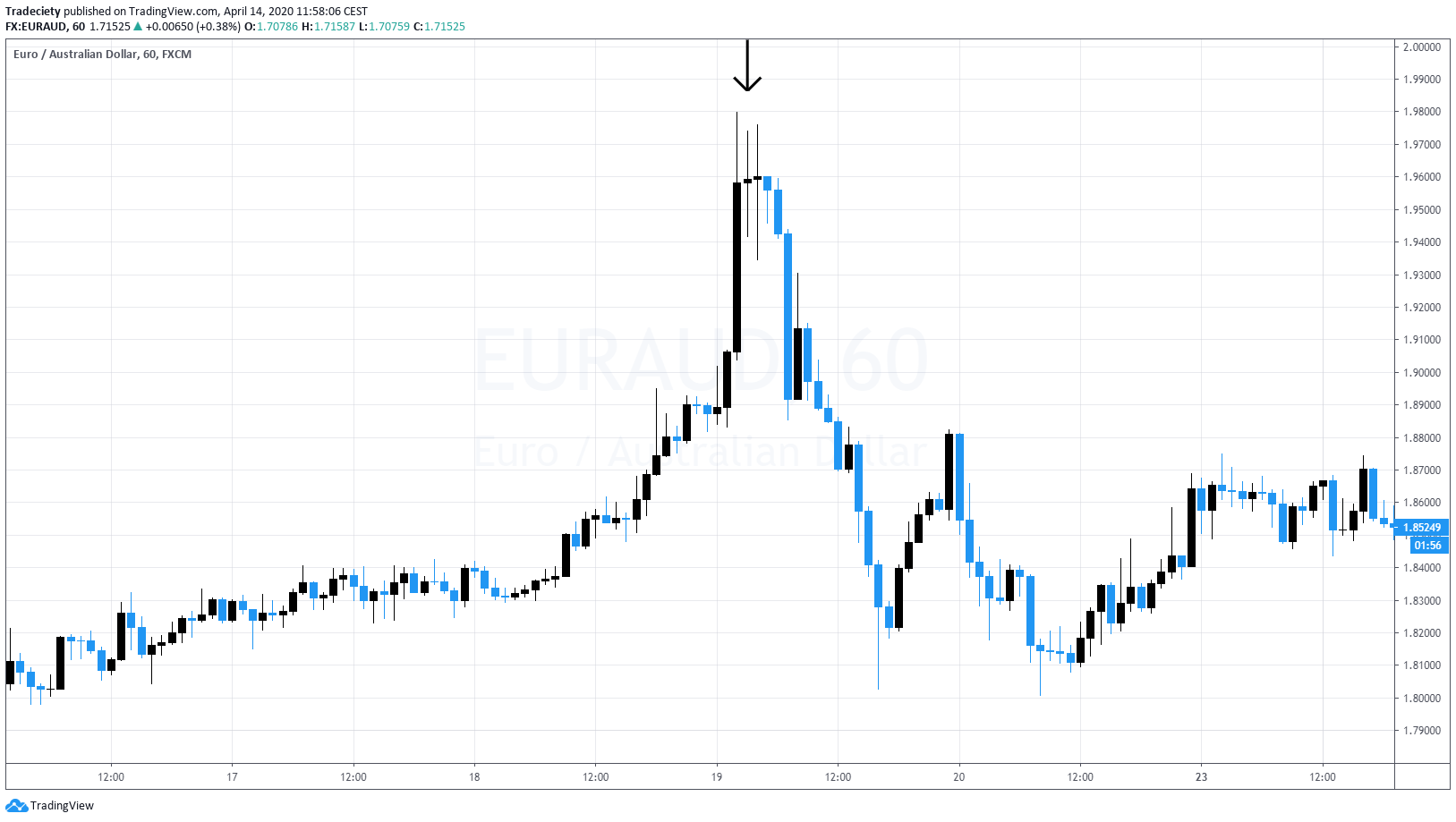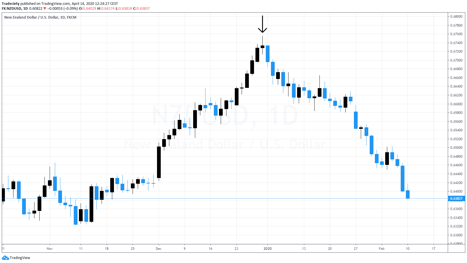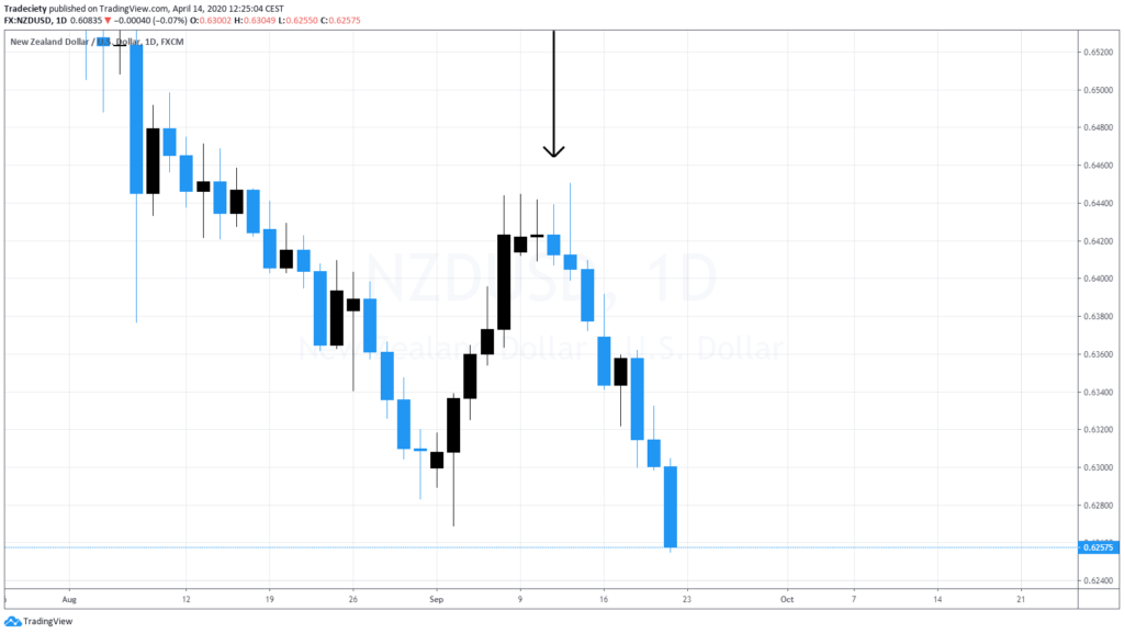 And then here it slowly rolls over. You can see we have this pin bar here and then to the downside, the candles size accelerates again, same when the ball accelerates its movement to the downside, it will accelerate and accelerate. So this is the concept behind deceleration acceleration. Here we can see it in the context of a trending market, so the market, wasn’t a strong uptrend and this is called an evening star or Morningstar pattern. You have strong candlesticks leading into the turn into the top. Then you have a very small dodgy pin bar candle which shows you that the momentum is decelerating and then on the other side the momentum is accelerating to the downside. So we can really nicely follow this momentum and we can really nicely see how the momentum is turning. When you look left, you could also include a support resistance area.