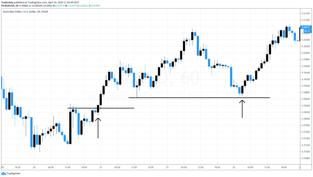 So here you can see the market has a very strong bullish candle, then a very small bearish candle and then here it has a strong bullish candle. Here we have the same picture, small bullish or bearish candle and strong bullish candle. It is not enough to trade an outside bar on its own. They are not strong enough signals. Keep or remember or just seeing in this context you will see that those are just single candle sticks so we need to apply context and other rules to the outside bar. It is example we or I use support and resistance and swing highs and lows to complement as trading idea. So here you can see this outside bar happens right at the previous high point so this isn’t a breakout confirmation. The market is breaking above the previous highs, continuing the uptrend that was already started. In this context, the market is coming back into a previous support level.