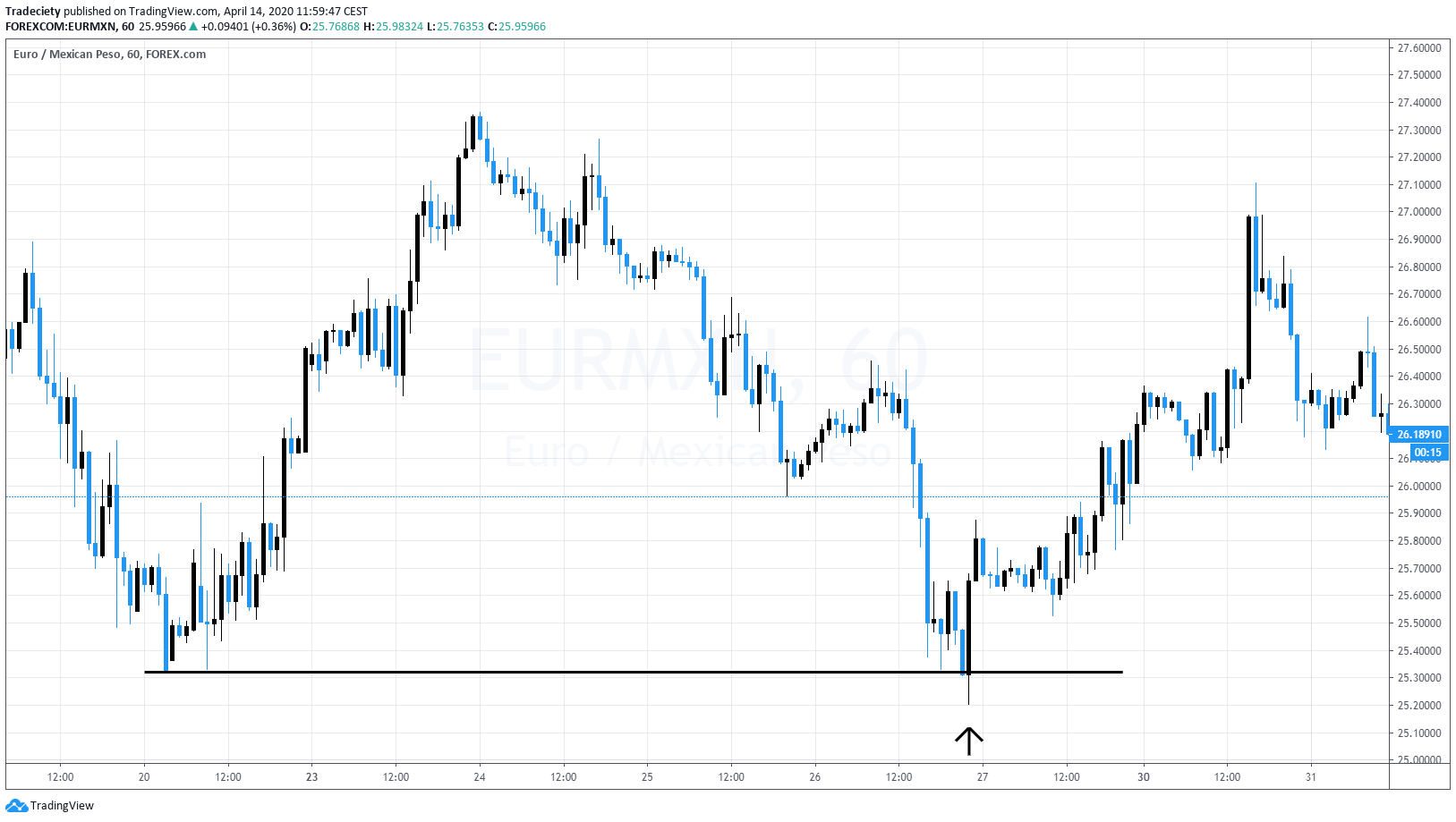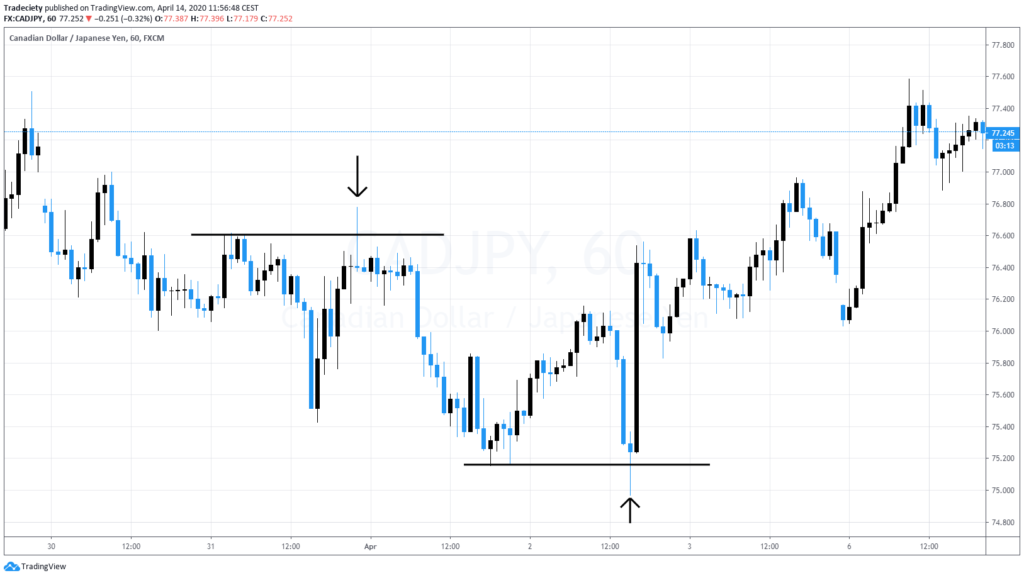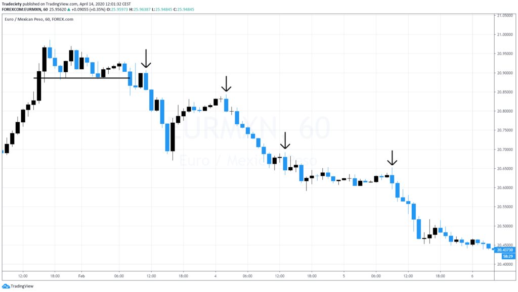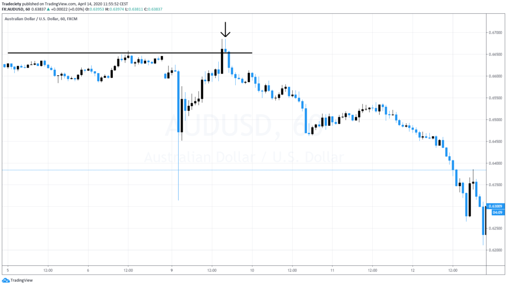 Tweezers are very famous because they are built around to pin bar pattern, but it’s not only a single pin bar but the tweezers, user’s two pin bars next to each other. So this is usually what a pin bar, what a tweezer looks like. You have a very strong resistance level. The market moves into the resistance level, gives you one rejection candle, gives you another rejection candle. Two very strong pin bars showed rejection of the level. No momentum year, no interest to really break higher. So there’s no bullish power behind this move. And then to the downside, the market accelerates and continues to bearish pressure.