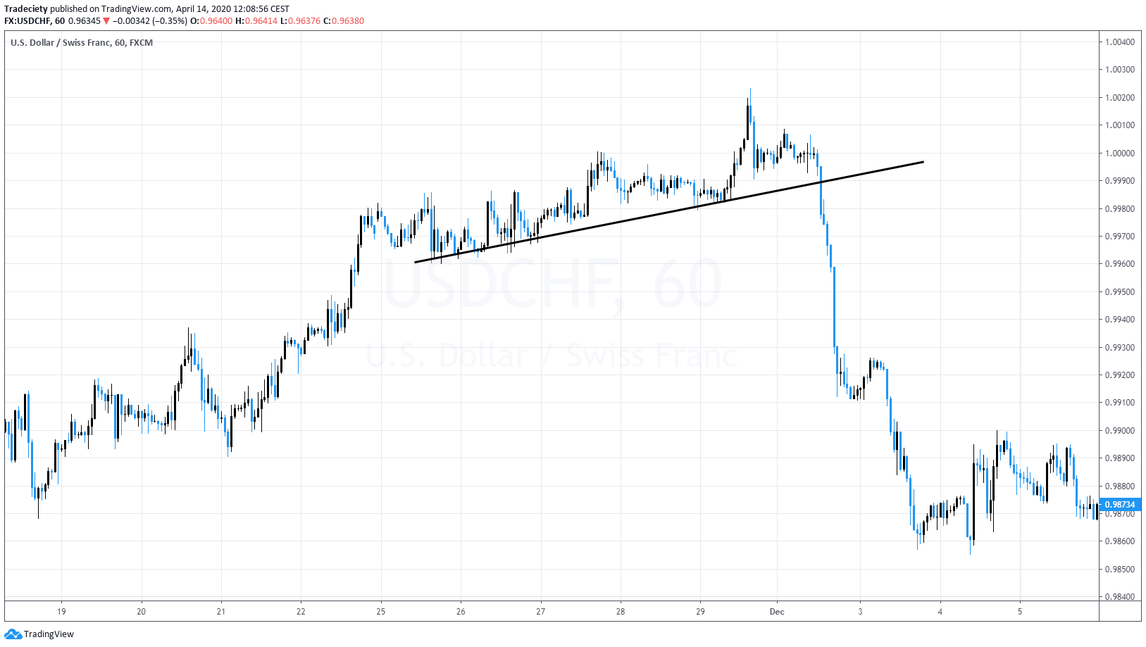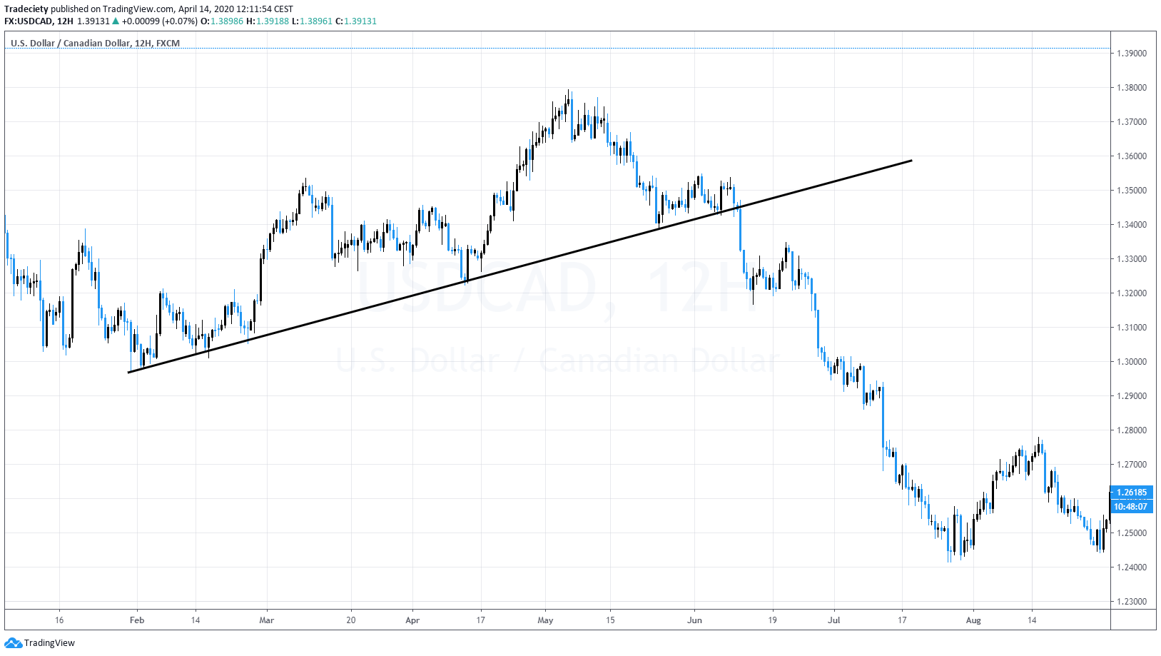 So when we look at the origin of this trend, you can see the trend started very, very strong, very strong, bullish, um, interaction and very, very strong bullish phase. The market here rallied very quickly and then here as the market moved into the top, the trend line became shallower and shallower. When you put a trend line here, it’s a very steep. When you put the trend line here, it’s very shallow. And then here on the breakout, the market then completely sold off. So the trend line breakout, especially when you put it into the contest, when you see that a trend is actually slowing, it can help you to point towards opportunities where the market is going to roll over. So a trend line break out can be used as a reversal pattern.