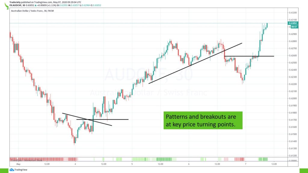 We can apply even a Fibonacci to this. So when we measure our A to B move, we look at does this, really respect a Fibonacci retracement. And then we can use the extensions to find our target. This is how it looks. We apply the Fibonacci from here to here. You can see the Fibonacci retracement, a perfect 38.2 retracement. And then here you can see the market moves into 138, it moves into the 161, it moves to the 200 and even to the 261 so you can use the Fibonacci after the retracement to time your targets as well. Patterns and breakouts are at key price turning points. I can’t stress this enough. A trader that is able to identify great patterns with grade levels and then is able to time the breakouts can potentially transform his trading. Just in this snapshot, we’re going from downtrend.