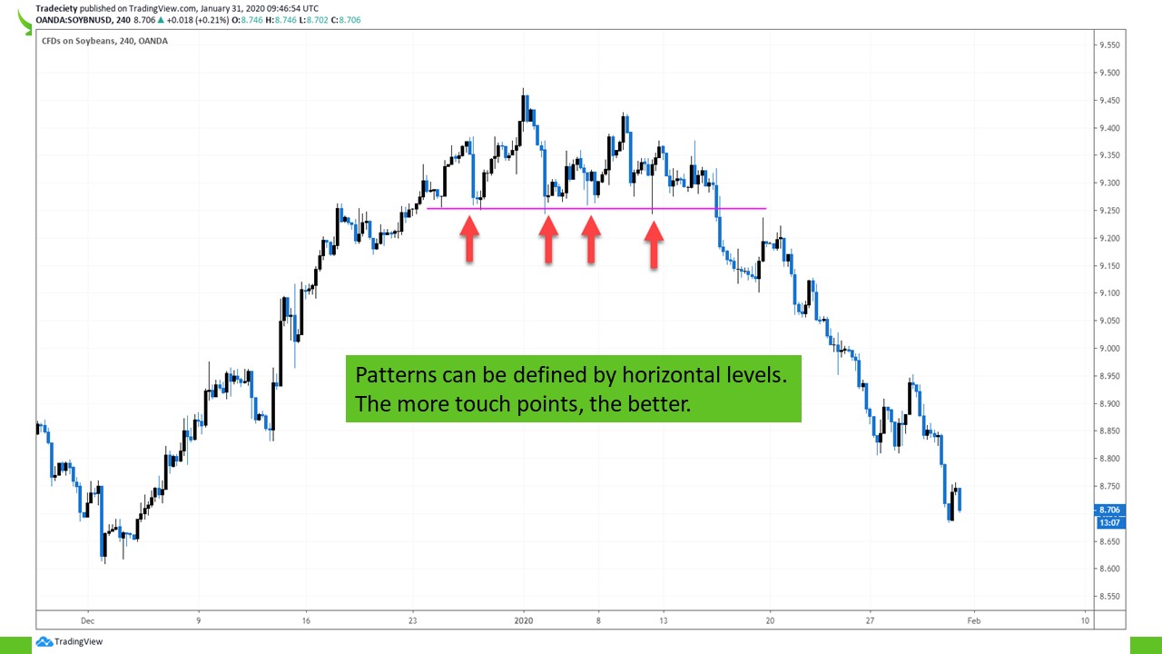 we need to look for patterns because a breakout out of a pattern is the most important factor and a breakout out of a verified and the very strong pattern will often provide better trading opportunities. And patterns, as we will see in this video come in many different shapes and forms and sizes and a pattern in the most basic sense is defined by a horizontal level of support or resistance. In this example you can see this a, a market was in an uptrend. Then the market moved sideways here in the range market with a very, very well defined horizontal pattern and with a very horizontal support level, you can see the support level has one, two, three, four, five touch points. The more touch points, the better such a level is, the stronger such a pattern is, and the more meaningful a breakout out of the pattern is.