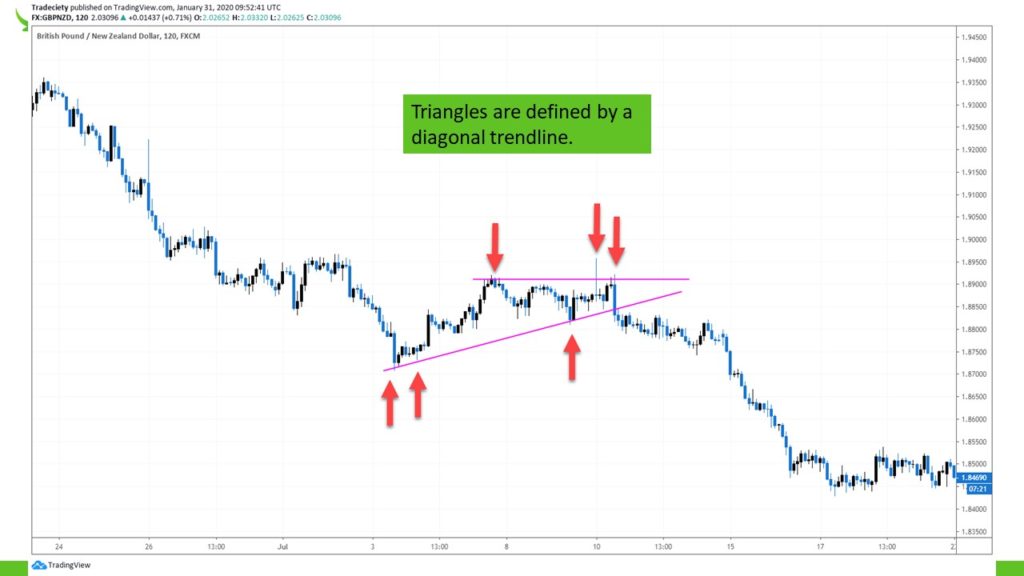 Again, we really need to wait for the market. First of all, we need to wait for a pattern to be established and to be verified, which happens with multiple touch points. And then you need to have your breakout. It can go either way. The price can go either way on the breakout, it can break out to the upside, it can break out to the downside. So you really want to make sure that you are looking at a confirmed breakout and you don’t trade as long as the market is within the range, that’s really, really important. As I said, patterns can come in many different shapes and forms and not only horizontal levels are going to help us to define patterns but also um, diagonal trend lines will help us. In this example, the market was in a downtrend, then the downtrend consolidated here for quite a while and here then we are what the price established, a very well defined triangle pattern with a trend line