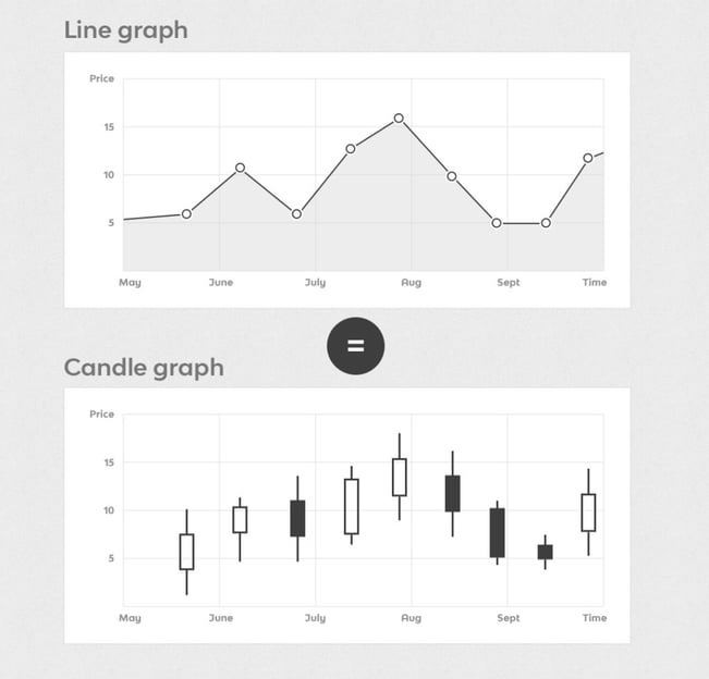 So when we now put a few candlesticks after each other, like in this example here you can see we have a bullish sequence, we have some bearish candles and when you connect the closing prices off the candles, you will get a line graph and the line graph would tell you also a lot about what is going on. The candlesticks just provide a little bit more information about volatility, about momentum and how strong intro candle momentum is. When it comes to understanding the bullish and bearish strengths of the candlestick,