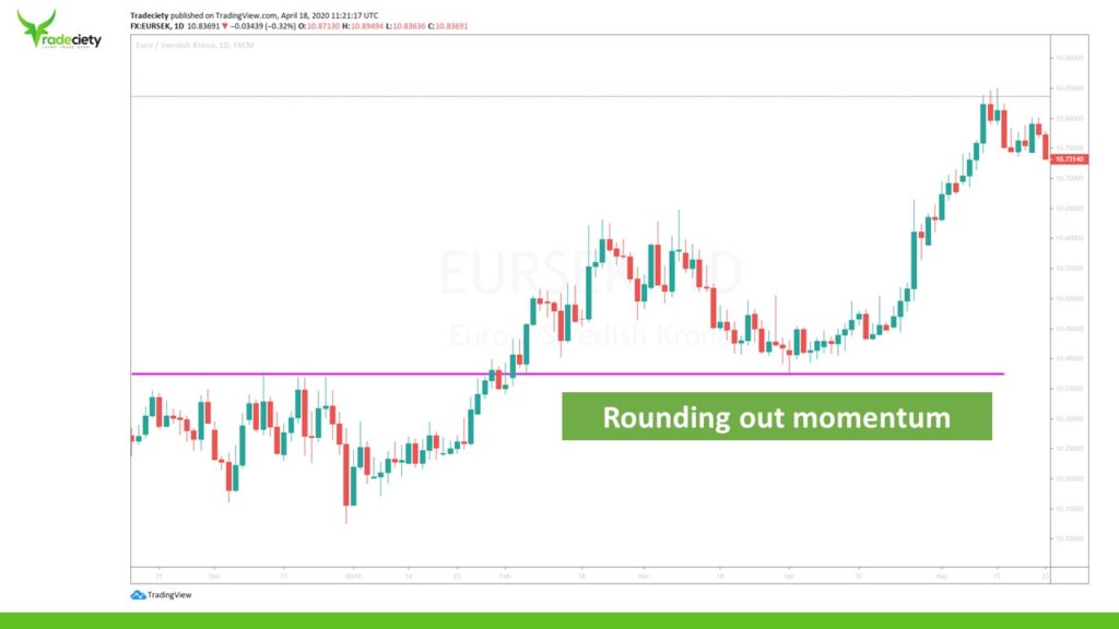 Here we have two of those signals together. First you can see we have the rounding effect where the market jumps higher and has a very, very strong trending market. And then as we reached a top, the candles becomes smaller and smaller and smaller. So we have no momentum. The bears are dying, um, the bulls are dying down, the bulls are leaving the market and then here suddenly we have this acceleration away from the level, very, very strong candlesticks