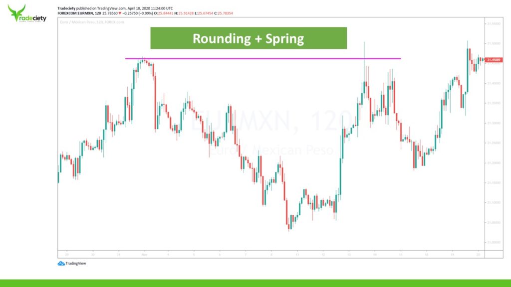 suddenly when it becomes obvious that this rounding is not going to lead to a higher, um, push. And then you can see the full collapse and then this following downtrend. You can also see that during this pull, pullback phases they start very strongly but then very soon the momentum is fading. You have long wicks, you have rejections, and then the downward resumed strongly. Another pullback strong at first but then the counts become weaker. They round off with a rejection and start a new down trending wave and this happens all the time. This is a very, very common chart pattern that you will see. You need to pay attention to candlestick size, the ratio, how does it change and then here at the right hand side we have the spring pattern. The market comes back into the previous high. It tries to break above it but it fails and you have multiple candlesticks with long wicks and here as well, the market tries to come back and now this time it doesn’t even come close to the previous side, which is already an important tell.