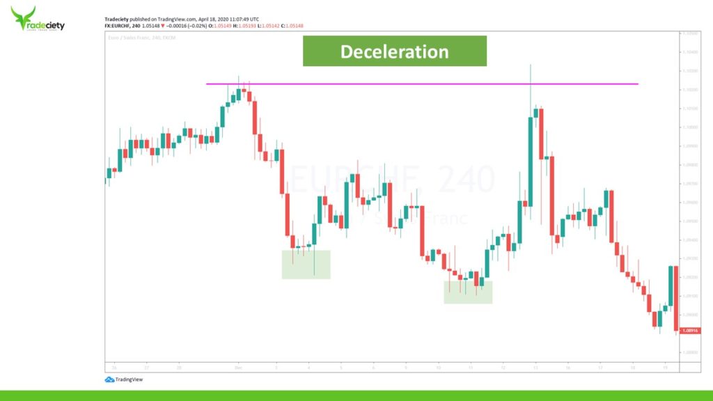 Deceleration. Acceleration. I’ve been talking about this a lot lately in my videos. It’s very important and it can tell you a lot about momentum and price structure. So during this down trending phase, we have very strong bearish candles, but then here we have a small bearish candle. We have three dogies, and then here we have the rejection. The market moves a little bit higher. You can use this information as soon as you see that you have rounding off and you have this outside pin bar that you go to a lower timeframe to time your bullish entries. This is something that we also do in the master class, especially with modern state trading approach. Here we have the exact same principle again. The market moves a little bit lower than the previous low. It rounds off.