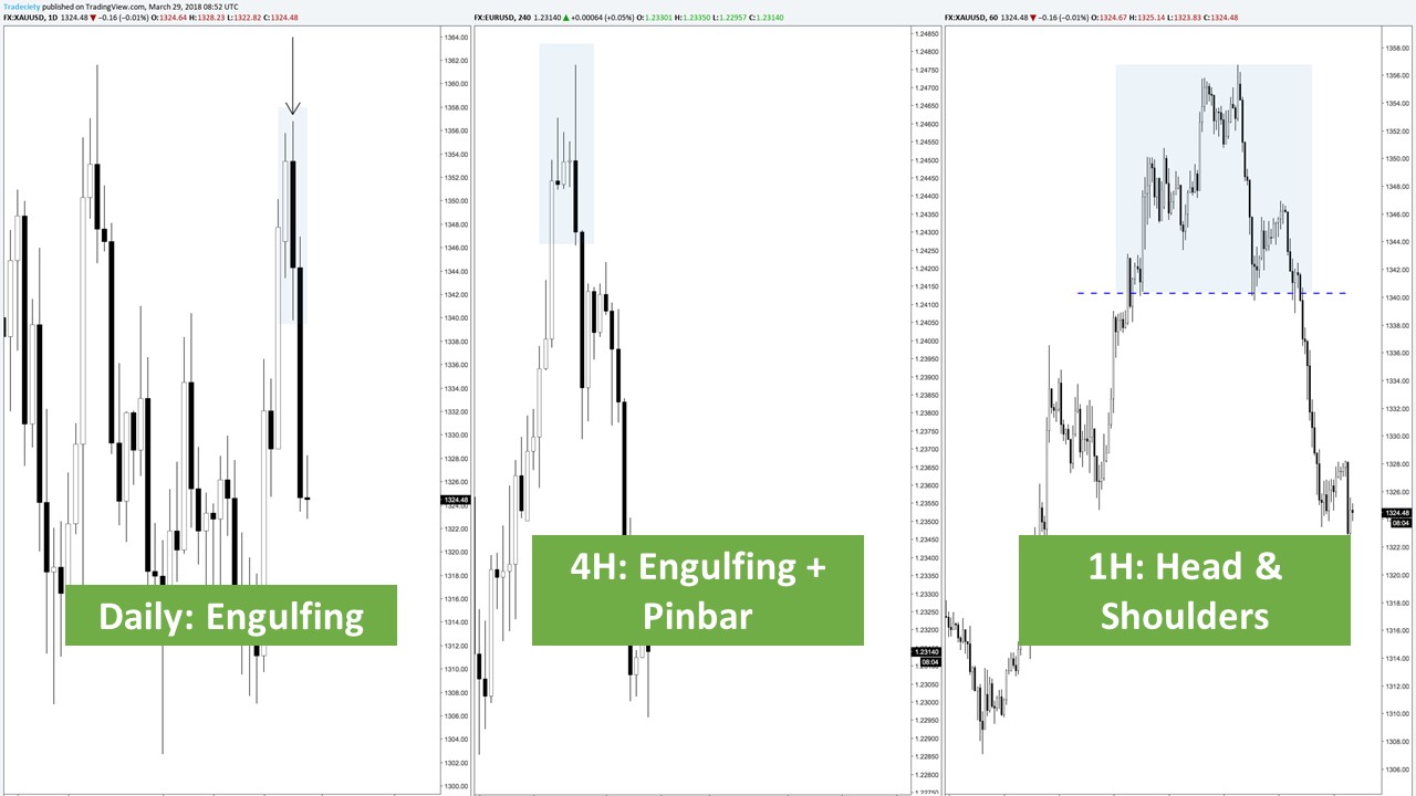 You can see we have a very strong bullish move first, then the momentum dies down. And then this candle here first has the components of the pin bar with the long candlestick wick showing us a rejection. And then it also has the component of the engulfing candle where the price completely closes at the low of the candle. It leaves a very, very strong body. It is completely outside of the previous three candlesticks. So by understanding and by just going to a lower timeframe, we can already see that how this bullish candle looks on the lower timeframes. If we now go to the even lower timeframe to the one hour, we can see how this engulfing candle on a daily looks actually like a head and shoulders on the one hour timeframe. You can see this price behavior very nicely. We have the left shoulder here.