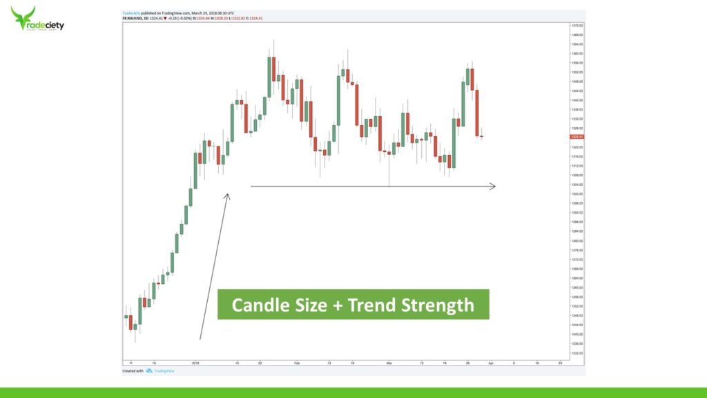 it’s actually a very nice technical candlestick pattern. When we try to understand candle size and trend strengths, this can also help us a lot. During strong trending markets you will often see that the candlesticks only have one color. They are pushing into one direction very strongly.