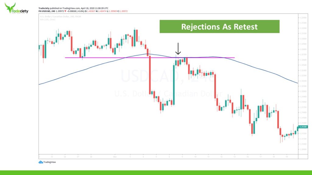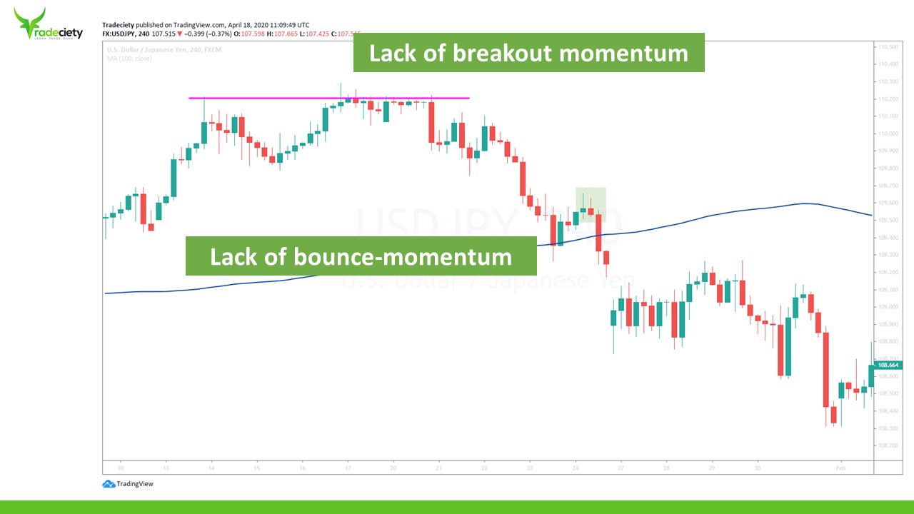 So we have a very strong support level here. The market breaks below the level. It also breaks below to 100 period moving average, a very strong downtrend. And then the market shoots back up into the level very, very strongly. This is a huge candlestick and it looks like the market may fall back into the range. But what happens just underneath this level is very telling. The candles become smaller. Now we have, and even smaller here and we have more bearish candles as well and the market is really stopping just underneath this level here. So this strong candle doesn’t have a follow up and the market really, uh, really just completely dies down. A momentum dies down and there is no attempt, no successful attempt to break higher. And here you can see we have an engulfing candle, a strong bearish candle, which could further confirms there’s,