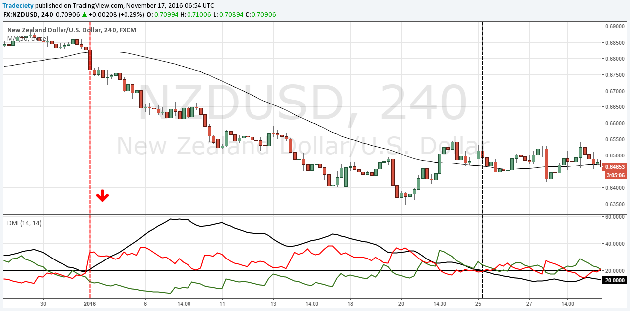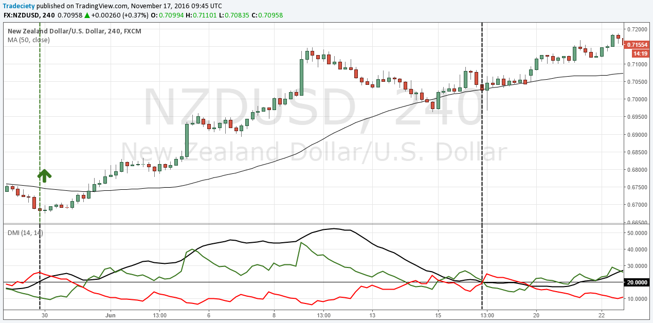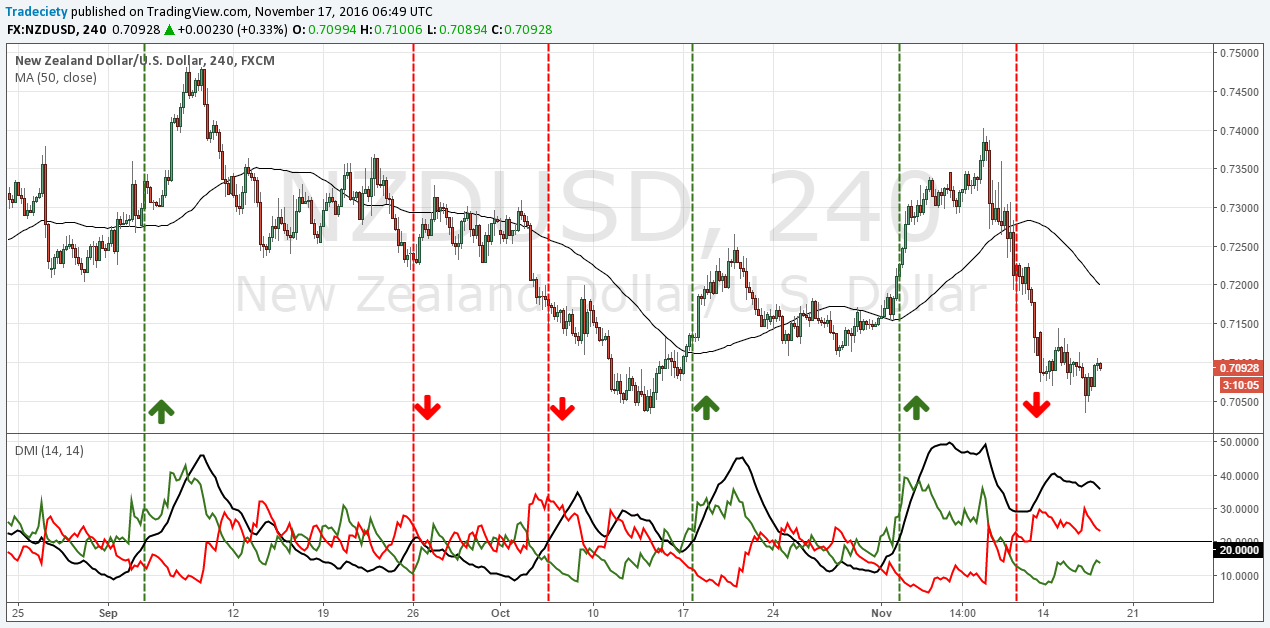 In the AUD/NZD chart, there were 5 ADX signals and we marked each with a vertical line and an arrow indicating the direction of the signal.
