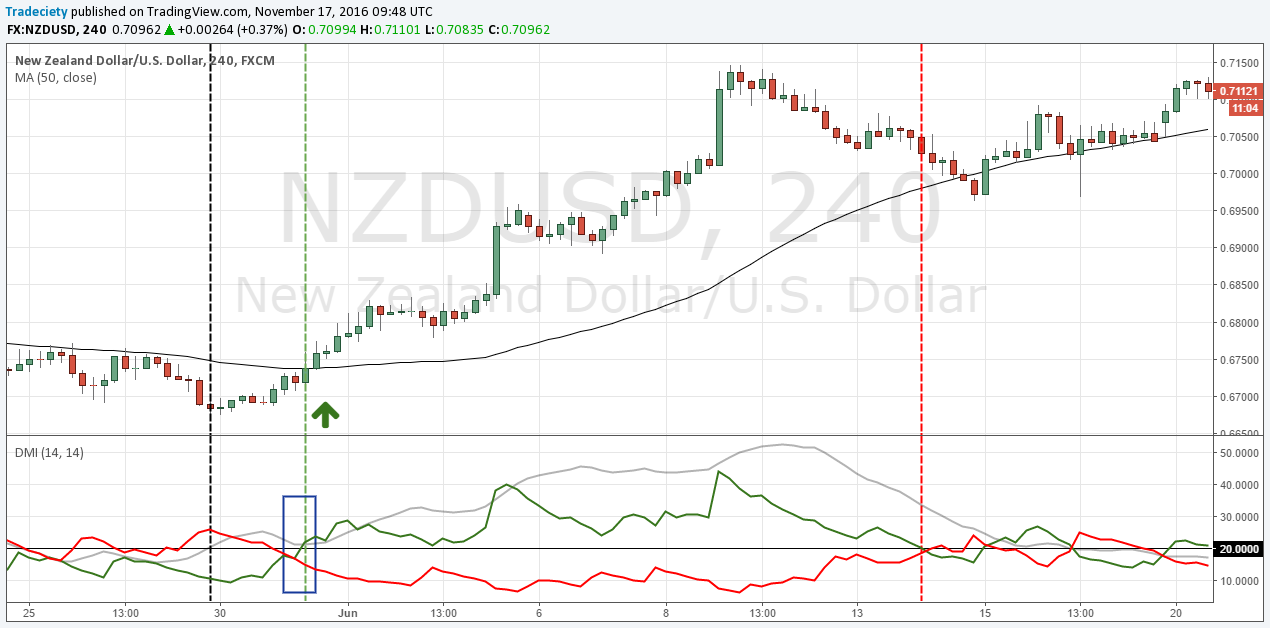 In the screenshot below we can see this nicely. First, the ADX line crosses above 20 (first black vertical line) but at this point, price was in a range. Then, things turned around and the green line broke above the red DI line and the ADX started to pick up again. The uptrend then gained momentum as the ADX was pointing up and the green DI line stayed above the red DI line. Once the red DI line crossed above the green line, the trend was over (red vertical line).