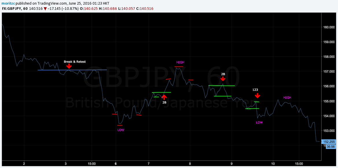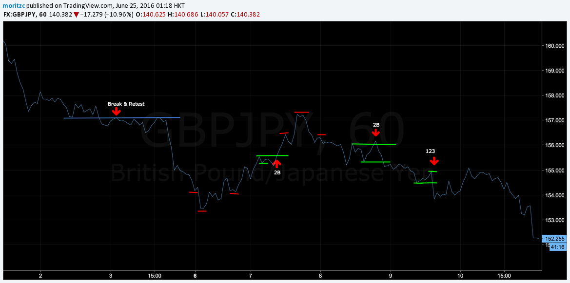 Now when we switch back to candlestick charts, you will see that you see that every pattern I drew here actually cut through the wicks of the candles. This is how I have been drawing my S&R levels anyway, however doing it with the line chart makes it so much more obvious and easy on the eye. Sure, trained eyes will spot 1-2-3’s and the like just as easy as I do on a candlestick chart, but I never actually SAW these patterns on the candlestick chart UNTIL I saw them first on a line chart – that’s when they actually started to make sense to me. Other trades would point their patterns out to me and I would be saying ‘what, where? I don’t see a thing!’.