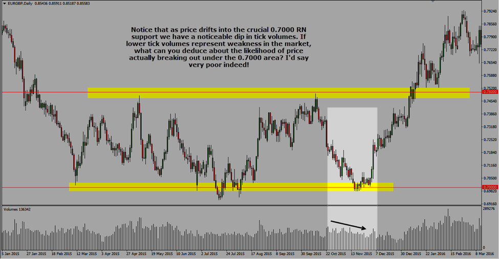 Thinking about it, tick volumes may not be giving us real-time order flow cues, but they are giving us a fair idea about how rapidly the price is moving in a particular direction (more rapid price movement equals higher tick volumes). As a price action trader, this bit of information can be gold when put in tandem with other relevant information.