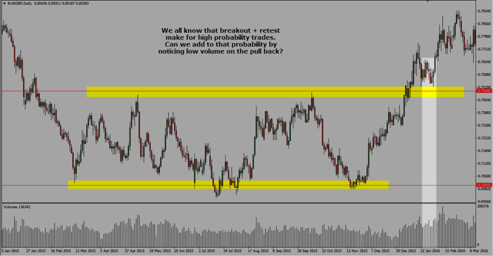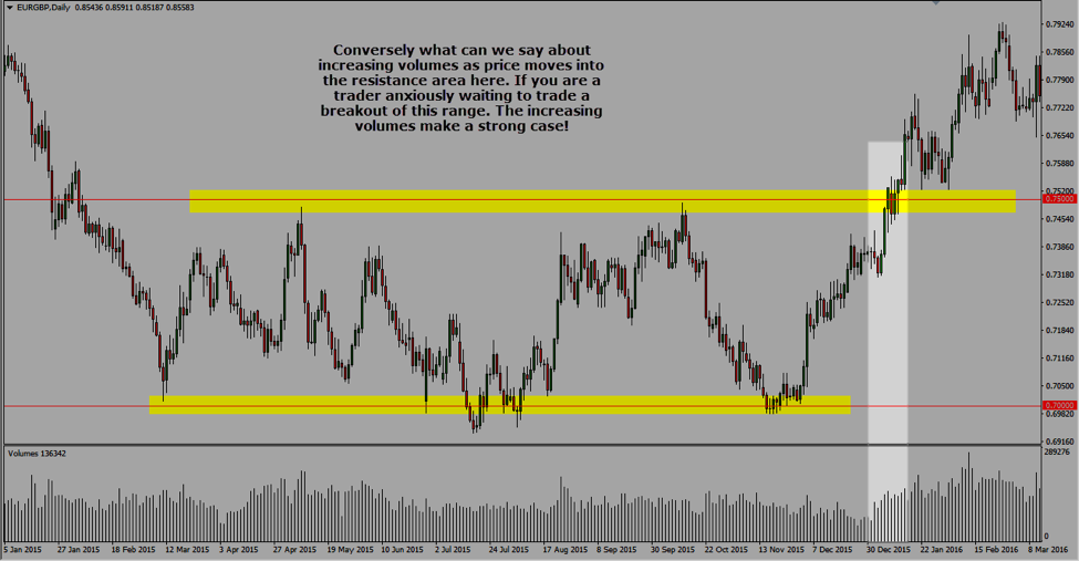We are looking at the EUR/GBP daily chart with an interesting range-bound market stuck within the 0.7000 and the 0.7500 price levels. Let’s use tick volumes to deduce price action moves on this one: