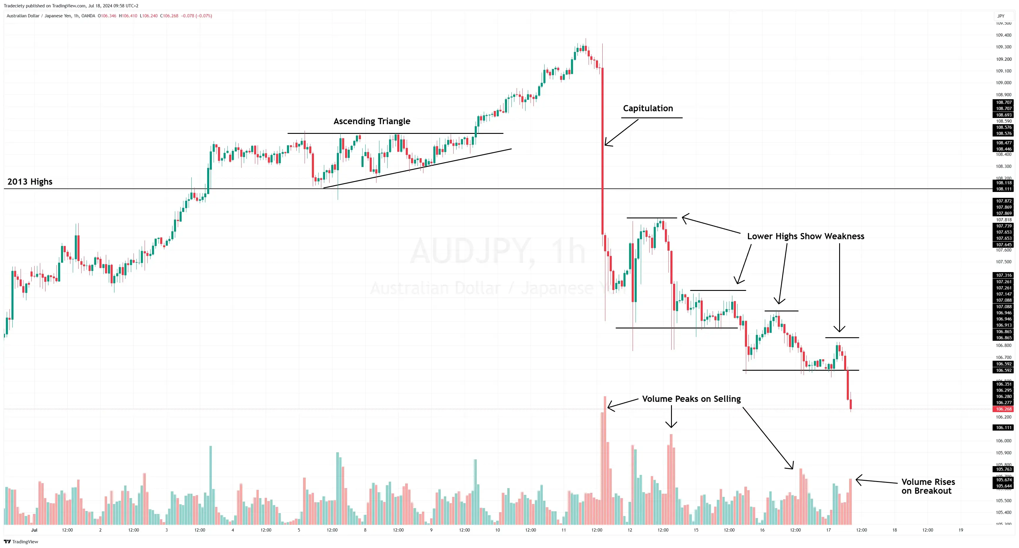After the capitulation, the price made lower highs. Interestingly, the volume spiked on the red downward candlesticks, confirming the strong interest in bearish trading. The bullish candles, on the other hand, showed a decline in volume.