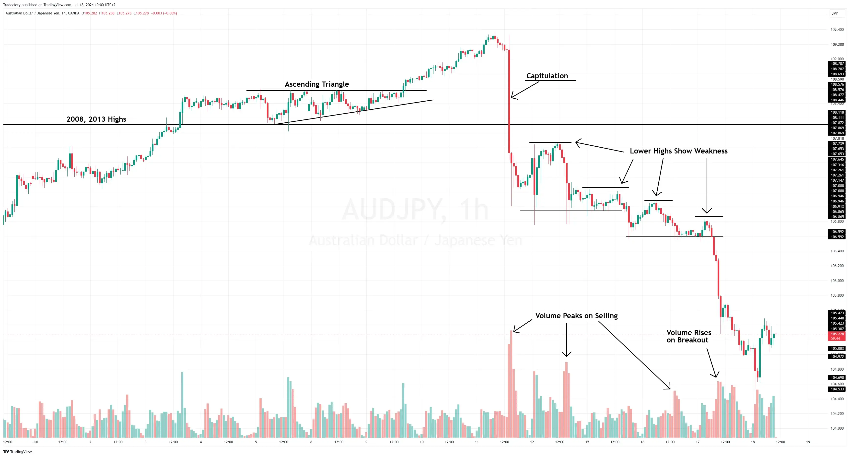 When the breakout into fresh lows occurred, the volume spiked again. Strong bearish candles accompanied by higher than usual volume can be a great trend-following signal.