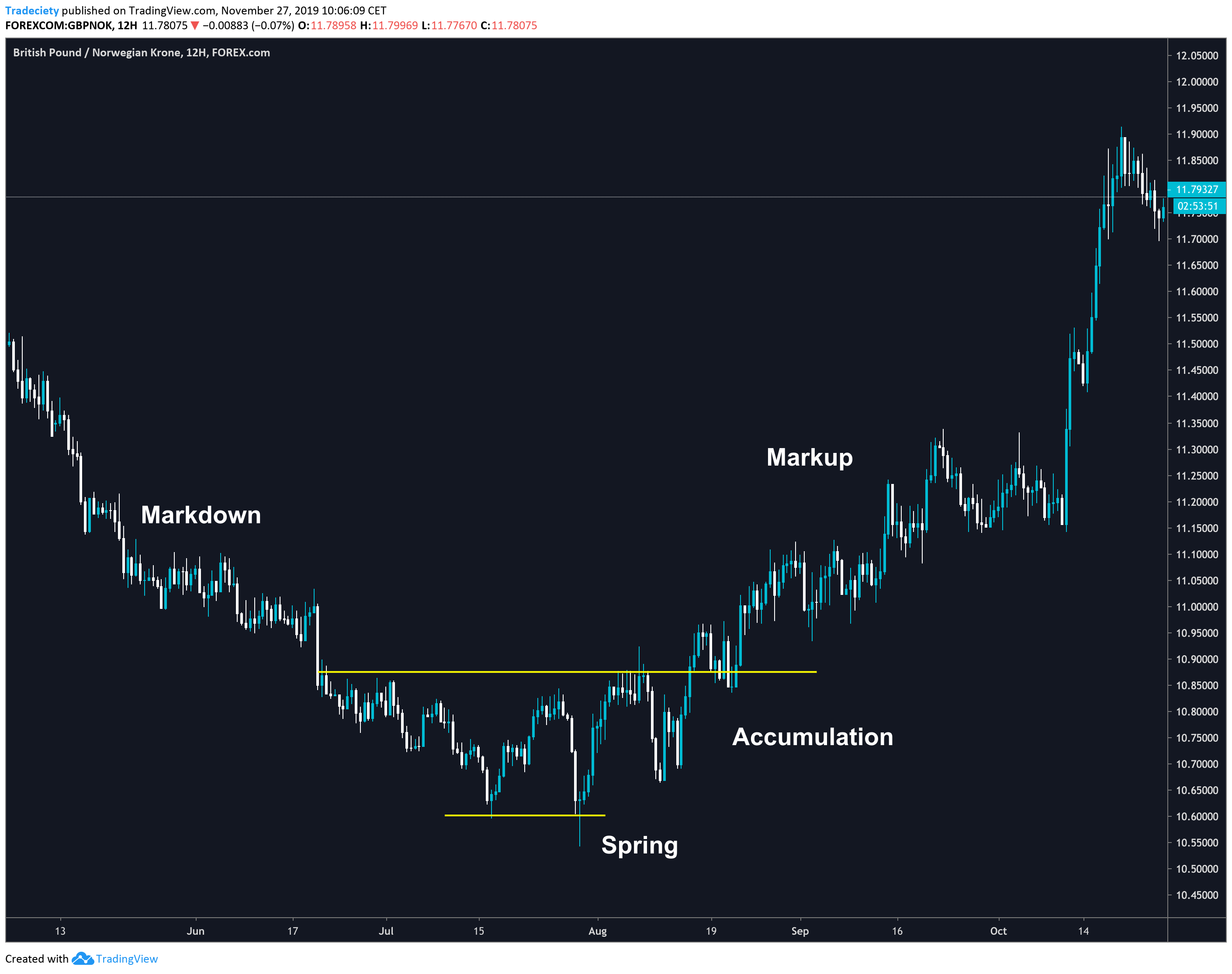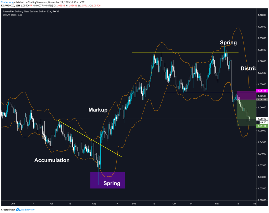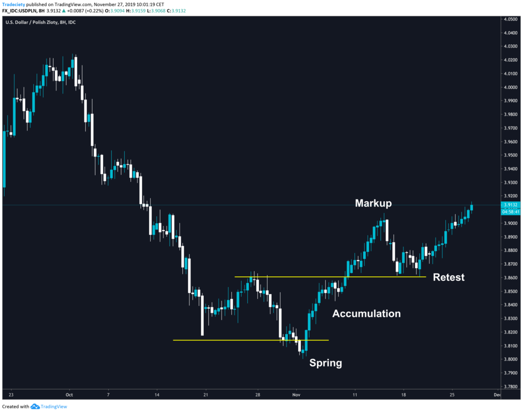 On the right, you can see a trade that I am still in (by the time of publishing this article, the trade has reached the take profit target). I traded the breakout out for the distribution zone. The spring was a single pinbar candlestick that took out all previous highs. The distribution was defined by a great horizontal support level. Horizontal levels make trade-timing easier, compared to trendlines because they are less subjective.