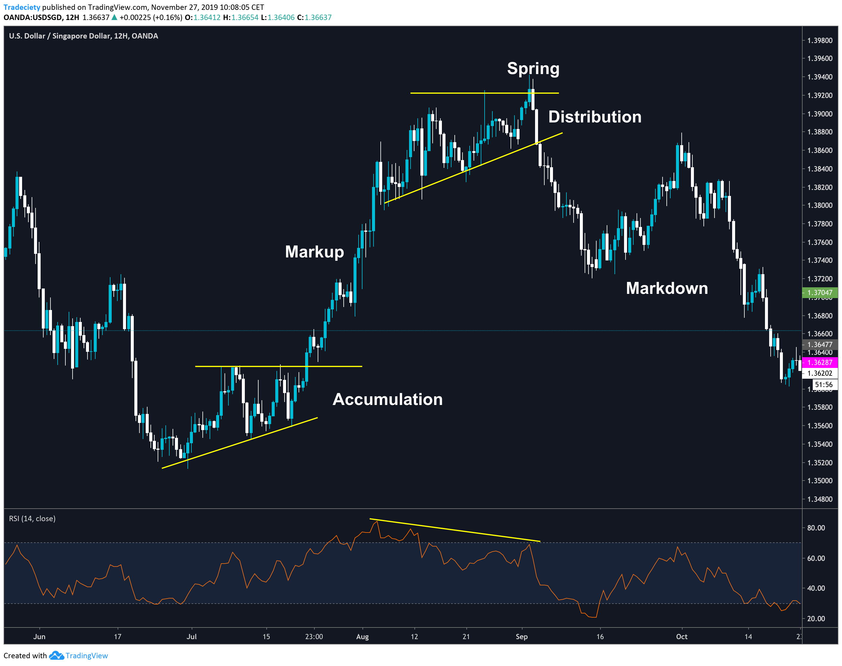 In the scenario below, the distribution phase happened while the RSI indicator was showing a divergence. Although this distribution is not a perfect sideways consolidation, one can clearly see how the uptrend was losing strength. The trend waves became shorter and the price had a hard time making higher highs. At the top, the spring showed a failed breakout that immediately reversed lower.